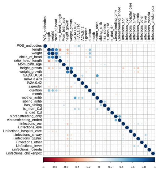 The pre-processed version of the DIPP data set is a data frame with 30 attributes, including the binary response variable for 1329 subjects. Later, the data set was synthesized numerous times via the syn() command from the synthpop package using several methods. As mentioned earlier in Section 3.1.1, the first variable to be synthesized in the data is by default generated using the "sample" method. In our case, the response variable, "POS_antibodies", was the first to be synthesized, and then the rest of the attributes. For the reader interested in detailed implementation, Table A1 provides the list of all attributes in the data set and their descriptions in the order of synthesis, i.e., "visit.sequence".