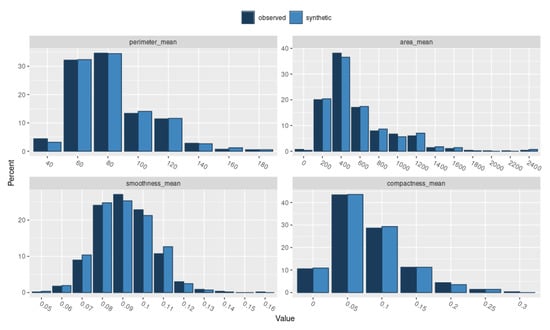 From the correlation matrix (Figure 2 and Figure 3), the original and synthetic data sets clearly have similar strong correlations between most variables. The relative frequency distributions analysis for the original and synthetic data sets (Figure 4 and Figure 5) report similar distributions between the original and synthetic data sets’ variables. The UMAP embedding for both original and synthetic data sets (Figure 6, Figure 7, Figure 8 and Figure 9) shows that samples belonging to each class form individual, similarly shaped clusters. However, the global structure of the WDBC synthetic data set is mirrored compared to the original data set in Figure 9. Furthermore, the data similarity between the original (DIPP and WDBC) and synthetic (SynD1 and SynW1) data sets of all discrete and continuous variables using the Kolmogorov–Smirnov two-sample test can be found in supplementary Table A2 and Table A3. A Kolmogorov–Smirnov two-sample test affirms that the analyses show evidence to reject the null hypothesis. That is, the variation in the distribution of these variables is statistically non-significant, as all attributes have a k S p -value larger than α .