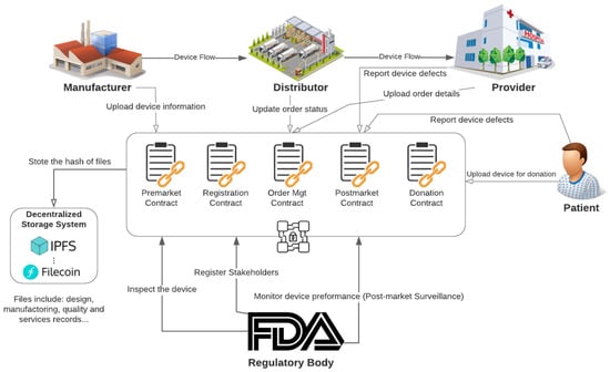 - Pane, J.; Verhamme, K.M.C.; Shrum, L.; Rebollo, I.; Sturkenboom, M.C.J.M. Blockchain Technology Applications to Postmarket Surveillance of Medical Devices. Expert Rev. Med. Devices 2020, 17, 1123–1132. [Google Scholar] [CrossRef]