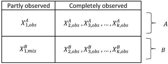 Consider a dataset with n observations and k variables. Suppose that only one variable, , has MD and the other variables are fully observed. Let A be the subset of completely observed data, and let B be composed of observations missing on but fully observed on (Figure 1). is the observed part of , and is the missing part of . The objective is to compare the distribution of and , but since data are unobserved on , a regression model is built to explain from A. Then, this model is used to make predictions and for both and .