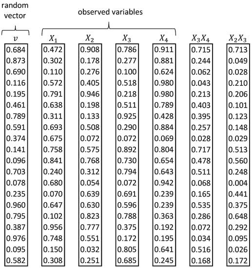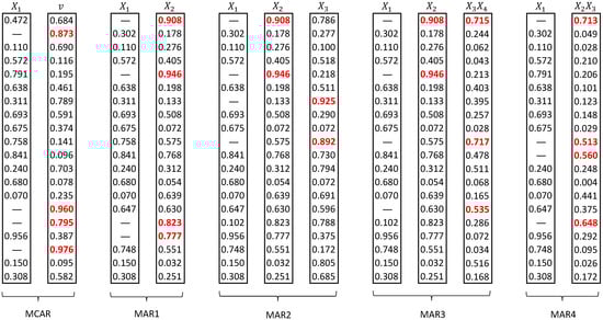 Figure 2 and Figure 3 explain the different MD mechanisms on a reduced example with only 4 variables (instead of 10 in the real simulations) and 20 observations. Figure 2 represents a complete dataset composed of four uncorrelated variables, to , following a distribution, and of two interaction terms, and . These interaction terms are a simple multiplication element by element of the generating variables, which is commonly called the Hadamard product [38]. In addition, there is a a random generated vector, , that does not belong to the dataset, but that is used to generate MCAR data. The desired quantity of MD is 20% (4 observations). Figure 3 represents the MD mechanisms. For MCAR, the highest four values of the random vector are used to assign missing values to . Then, the original complete variables are used to define the MD in the different MAR mechanisms. For MAR2 and MAR3, some of the MD can be generated identically from both independent variables. In this case, one or several additional values from the second vector have to be used in order to have exactly 20% of MD for . That is why three values (instead of two) from the interaction are used to generate MAR3 for . Appendix A presents the R code for (1) the general way to simulate the MCAR and MAR1 to MAR4 mechanisms, and (2) the simulated example from Figure 2 and Figure 3. Notice that the difference between MCAR and MAR mechanisms lies in the fact that the random vector , which explains the presence of MCAR data, does not belong to the dataset, so it cannot be used in the regression model of the RB test, while vectors to , which explain the presence of MAR data, are in the dataset.