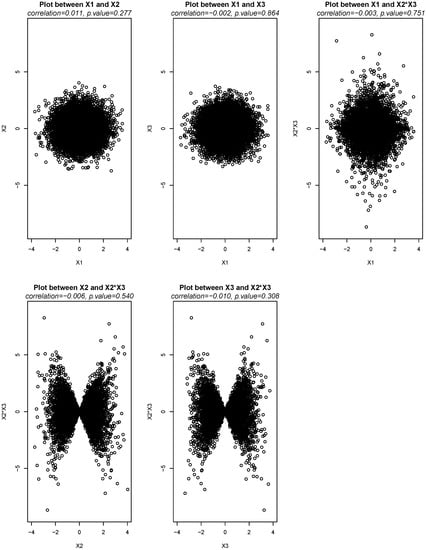 A dataset of uncorrelated variables following a uniform distribution (), two interaction terms (, ), and an independent vector . The sample size is 20.