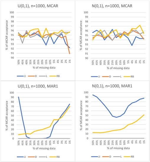 The main purpose of these simulations is to compare the behaviour of the RB approach with the Dixon, Jamshidian and Jalal, and Little tests. The four approaches were applied to continuous data, and the RB and Little approaches were also applied to categorical data for different MD mechanisms, sample sizes, and percentages of generated MD. For MAR mechanisms, all tests are performed using the nine variables as explanatory variables in the regression model. Moreover, because the MAR4 mechanism uses only an interaction term, the situation with this interaction variable added to the dataset is also tested (MAR4i). Each situation is replicated 1000 times and the percentage of acceptance of the null hypothesis (MCAR) by each approach is analysed.