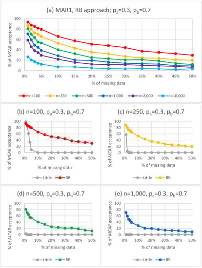 Finally, in presence of MAR data the probability of the RB approach to correctly identify this MD mechanism is positively correlated with the percentage of MD. The higher the percentage of MD, the higher the probability of rejecting the MCAR case. This behaviour is not surprising, since the more information (here: missing data), the easier it should be to identify the correct type of MD.