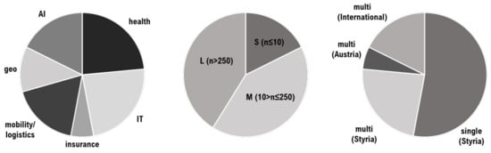 Interviews were carried out with respondents from institutions, corresponding to 9 FPOs and 8 NFPOs. Several more potential Styrian stakeholders have been asked via mail or phone to be involved in the interview study; these 17 are the number of all respondents who positively answered the request to participate in the interview study. FPOs comprise private companies from several industrial sectors, while NFPOs include institutions from the public sector, with the exception of a third-party construct of private NFPO that was formerly a public institution. NFPOs can be further classified into academia ( out of 8), government, or department in public administration ( out of 8). Stakeholder characteristics from respondents are presented in Figure 1. Participants come from several disciplines, grouped into Artificial Intelligence (AI), IT services and telecommunication, health, geosciences and geostatistics, mobility and logistics, and finance and insurance. All respondents hold leading positions or management responsibilities related to IT departments. The size of the organizations includes everything from start-ups and small working groups with up to 10 employees, small-to-medium enterprises (SMEs) between 11 and 250 employees, and large institutions with over 250 employees and up to the five-digit range.