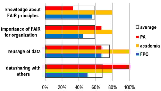 Attitude towards findable, accessible, interoperable, reusable (FAIR) principles among interviewees (average = gray), from for-profit organizations (FPOs) (blue), academia (yellow), and public administration (PA) institutions (red). Interview-Guide Section S4.7 in the Supplementary Materials.