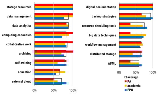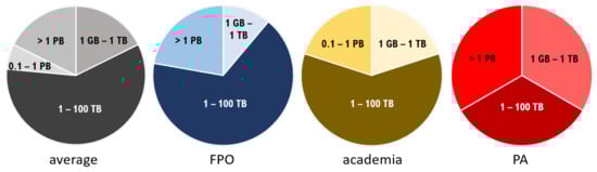 The goal of this study is to highlight the factors that facilitate the cooperative use of data and help understand the attitudes of Styrian stakeholders towards data exchange and cooperation. The main elements investigated include the technical requirements as well as specialized human resources and IT practices that are necessary for given data-related tasks. The wide variability observed in the responses from public institutions to questions on the use of data, sharing practices, and technical requirements, not seen in the private sector, suggested to subdivide the public group further into academia and PA. Three main messages can be extracted from the responses: Firstly, it strikes as evident that private and public institutions alike require the development of e-infrastructures for data capturing, processing, analysis, and storage to enable that enough data is shared; secondly, data management represents an essential task of the daily work-routine in all domains, but this does not necessarily imply the employment of big data and ML methods; and thirdly, the storage capacity needs frequent updating due to the fast growth of data volumes, and this requires well-thought data structuring and alternative approaches to develop cooperative thinking on data solutions. So far, the need for extended data infrastructures is managed differently among the various stakeholders, especially regarding service sourcing. Competitiveness notably present in private organizations makes this sector tend to a regular market analysis for strategic outsourcing []. This can be observed e.g., in the use of container-based technology, which has recently become popular for flexible application management and deployment []. Containers were mentioned particularly by respondents from private organizations and, in the public sector, by academia, but not by administration.