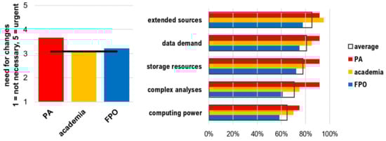 Need for changes in technical infrastructure (left) among interviewees (average = gray), from FPOs (blue), PA departments (red), as well academia (yellow). Change assessment of data-related tasks, applicability for % organizations (right). Interview-Guide Sections S3.2 and S3.7 in the Supplementary Materials.