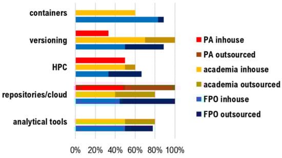 The acquisition of technical solutions over the last five years is summarized in Figure 6. While most of the new equipment, tools and container solutions have been built or designed in-house, repositories and cloud services tend to be outsourced. Versioning systems, repositories and analytical tools, of primary interest to businesses and research organizations, are usually built in-house, but a considerable part of them are also outsourced. According to the responses from public administration, such types of organizations do not acquire any analytical tools or containers, but instead have designed versioning systems in-house. Only a small portion of high-performance computing (HPC) and repositories were outsourced.