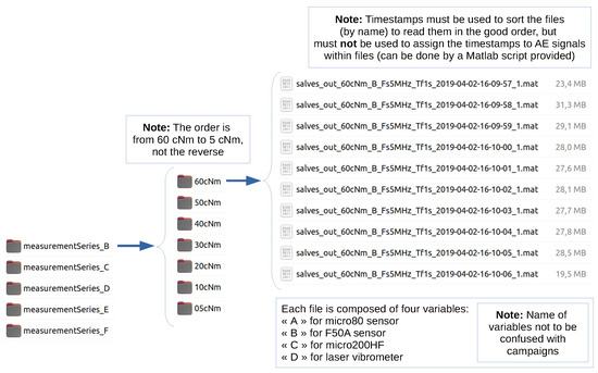 The organization of repositories and files is depicted in Figure 1 for series of measurements B. There is one folder for each series of measurements. The ORION-AE dataset is thus composed of five folders. For each series of measurements, there are seven subfolders corresponding to seven tightening levels: 60, 50, 40, 30, 20, 10, 05 cNm, except for measurementSeries_C for which 20 cNm is missing.