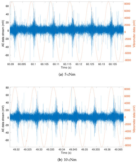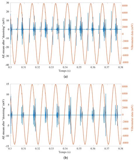In ORION-AE, the AE sources are related to tribological phenomenon characterized by low amplitude and with low signal-to-noise ratio. Denoising methods are thus generally used as a preprocessing step. Figure 5 depicts the result of wavelet denoising with 14 levels of decomposition and using a Daubechies “db45” wavelet (the same settings as [7]). This was carried out for two sensors in the same chunk of data as shown in Figure 5a,b. It can be observed that the responses of the sensors differ because they have different characteristics (in particular the sensitivity and frequency band). We can also observe the presence of AE signals that occur at each cycle with some regularity.