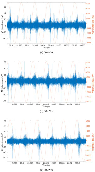 It is important to note that the real timestamps in filenames must not be taken as the timestamps of the AE signals in a data stream. The real timestamps must be calculated from the exact number of samples in each file, starting from s for 60 cNm. There are about 10 s of continuous recording of data per level and for the four sensors. The exact duration of a period can be found according to the number of files in each subfolder, the number of points per file, and the sampling frequency. The precise values are given in Table 1. A Matlab code (ORION_AE_sample_read_files.m) is provided in the data directory to read the files and reproduce the duration of each period.
