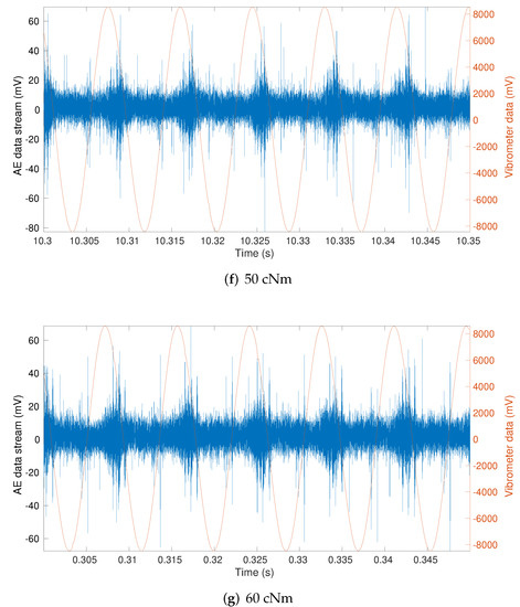 (a–g) Sample of the data in measurement series “B” with sensor “F50A” for each tightening level. Blue curve: AE signal; red curve: laser vibrometer data (harmonic vibration signal at 100 Hz with amplitude control).