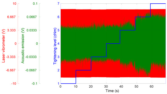 Tightening levels, acoustic emission, and laser vibrometer data superimposed for measurements “B” and sensor micro-200-HF (variable C). Due to the amount of data involved, a subsampling by a factor of 10 was applied for each file. The x-axis is here represented using the time of test (about 70 s), starting from 60 cNm from the left (around between s) to 5 cNm on the right (from s).