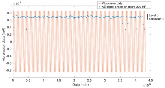 We took the starting time, called onset, of each signal detected after wavelet denoising (from Figure 5 using [7]). Onsets were then reported onto the vibrometer data in Figure 6. Each blue circle corresponds to one AE signal detected. The vertical position represents the amplitude of the displacement (measured by the vibrometer) when the signal was detected. We can observe that the amplitude is very similar between cycles (there is about 1 s of test represented in this figure), which means that the activation of the AE sources is highly reproducible between cycles. Similar results have been observed on other levels and considering measurements B to F. However, we also observed that several AE sources can occur in some levels, and that the average amplitude of displacement can change. It means that the instant of activation of the AE sources (related to the signals) seems to depend on the tightening levels. These observations can be dependent on the wave-picking algorithm used (here [7]), and should be confirmed in the future.