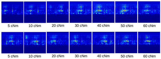 The classification task can consider up to seven classes in order to discriminate between the levels using various machine and deep learning methods such as support vector machines or neural networks [28,29]. By considering only the tightened levels, such as 60 cNm and 50 cNm, it can also be used to evaluate anomaly detectors based on autoencoders, self-organizing maps, or one-class classifiers [13,14]. In both cases, it is possible to use convolutional neural networks (CNN), taking as inputs the RGB images computed by the continuous wavelet transform (CWT) of the raw signals in each cycle. Cycles can be precisely obtained by using a zero-crossing detector on the vibrometer data. Illustration of such CWT images are depicted in Figure 7 using two measurement series (B, D).