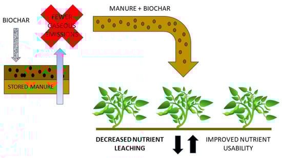 The data collected from this investigation of the interactions between the soil, plant, biochar, and manure elements of an agricultural system revealed a positive impact. Specifically, soil composition of organic matter, C, N, P, and K significantly increased []. Additionally, an increase of organic matter and C in the soil was observed in the greenhouse setting without affecting plant nutrient uptake []. While only swine manure was used [,], it would be interesting to consider manure from different types of animal production and manure-management systems and the effects on a biochar–manure mixture. In the future, studies investigating the interactions between these factors in a field setting over a longer period of time, with the inclusion of the manure type variable, will reveal more about these animal and crop-production systems.