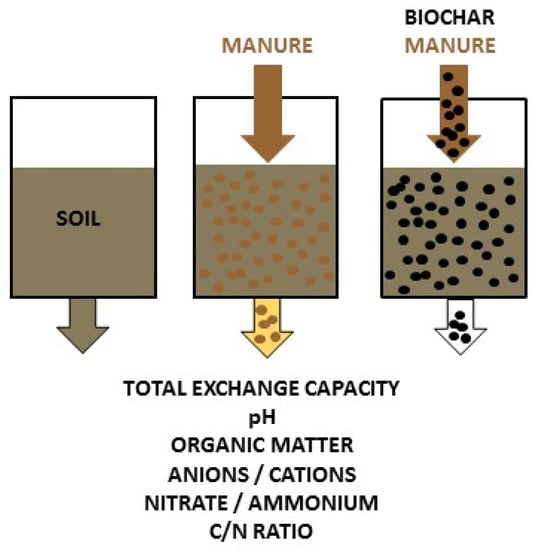 Four replicates of each control and biochar–manure mixture investigated were used to grow both corn and soybean plants. Plants were watered with deionized water every other day over a period of nine weeks. Plant biomass was then harvested, dried, and analyzed for nutrient content, nutrient-use efficiency, and other physicochemical properties. Soil was also analyzed for physicochemical properties with standard methods [,,,,,,,,]. Figure 3 shows the concept diagram illustrating the design of the experiment [].