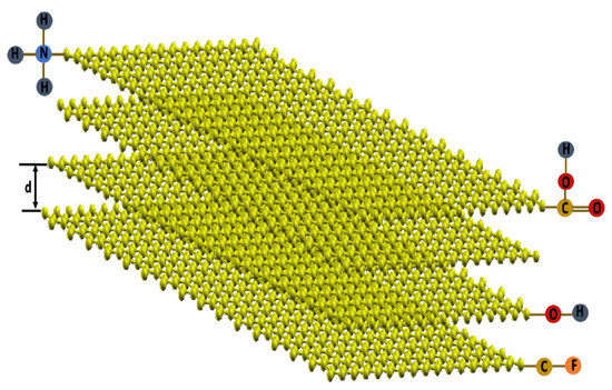 Diagram showing functional groups (ammonia, fluorocarbon, hydroxyl, and carboxyl) attached to the edges of one graphene nanoplatelet sheet consisting of approximately four layers of graphene. The approximate interlayer distance (d) is 3.35 Å.