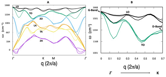 Calculated phonon dispersion relation of P-GnPs showing the (A) LO (black), TO (green), ZO (cyan), LA (orange), TA (yellow), and ZA (purple) phonon branches. (B) The LO (black) and TO (green) phonon branches are the only ones that contribute to the observed D, G, and 2D Raman peaks.
