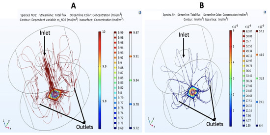 (A) Adsorption simulation involving NO2. (B) Desorption of air from the surface of the simulated P-GnP-based gas sensor.