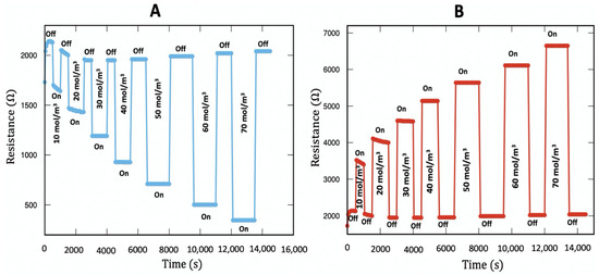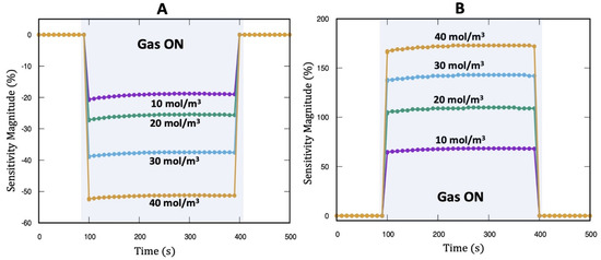 The percent difference between the resistance of the sensor in air and that in the target gas is defined as the sensitivity of the sensor. The response and recovery cutoff times are defined by a threshold value of 90% of the corresponding equilibrium value after the target gas has been injected (or removed) from the chamber [25]. Time-dependent sensitivity data are presented in Figure 5, where the exposure gas concentration ranges from 10 mol/m3 to 40 mol/m3. The sensor was predicted to achieve response and recovery times of about 10 s during such exposures.