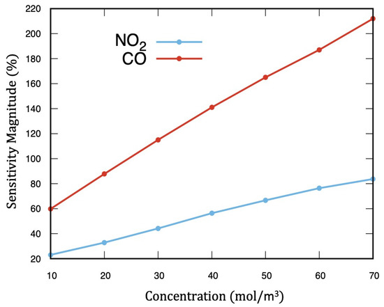 The sensitivity for each gas is also monitored as a function of concentration in Figure 6. As the concentration of NO2 increased from 10 mol/m3 to 70 mol/m3, the sensitivity gradually increased from 23% to 84%, whereas the sensitivity for the CO case increased from 60% to 212%, indicating that CO is more reactive with the sensor.