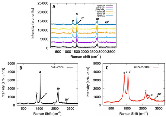 However, the D’ peak merges with the G peak, forming the G + D’ in the Raman spectrum of GnPs-35COOH as shown in Figure 9c. This is because of the G-band peak broadening, indicating a higher degree of disorder in the structure compared to the low density chemically treated GnP samples. The Raman spectrum of GnPs-35COOH is characterized by intense D and broad 2D peaks. The increase in intensity of the D peak of GnPs-35COOH in relation to the D peak of the GnPs with low density chemical treatment indicates an increase in the amount of the structural disorder. Also, the appearance of the D + D’ peak in the GnPs-35COOH spectrum could indicate more sp3-hybidized carbon relative to sp2-hybridized carbon.
