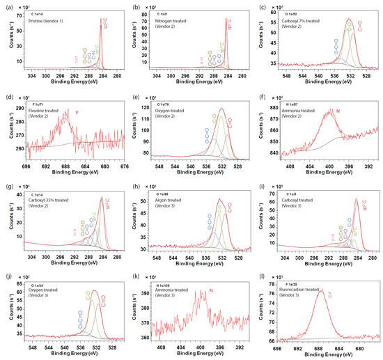 XPS spectra of a dozen different samples whose ranges were selected based on the type of chemical treatment performed. There are twelve distinct GnP types from three different vendors (as labeled in the corresponding tables) with the following treatments: (a) pristine (b) nitrogen, (c) carboxyl (7%), (d) fluorine, (e) oxygen, (f) ammonia, (g) carboxyl (35%), (h) argon, (i) carboxyl, (j) oxygen (different vendor), (k) ammonia (different vendor), and (l) fluorocarbon.
