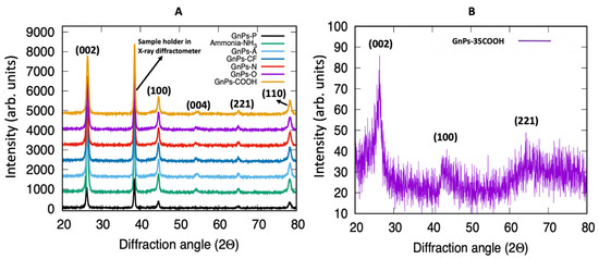 XRD spectra are shown for (A) P-GnPs (black), GnPs-NH3 (green), GnPs-A (cyan), GnPs-CF (blue), GnPs-N (red), GnPs-O (purple), and GnPs-COOH (orange). The various diffraction peaks are labeled accordingly. (B) The weaker XRD signal warranted a separate analysis of the GnPs-35COOH.