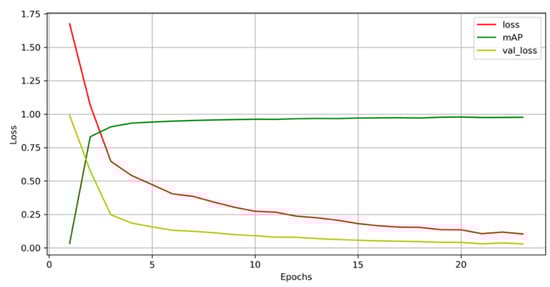 Basic model. Once the dataset has enough images to create the basic model, it is trained using [13]. The selected model is a RetinaNET [14], a one-step CNN (Convolutional Neural Network) which has already proven its effectiveness [15] for this task in [8], with a pretrained resnet backbone. The mean average precision (mAP) has been established as the parameter to be optimized. Table 1 and Table 2 show the hardware used, the training parameters and the result obtained, respectively. Figure 3 graphically illustrates the training results.