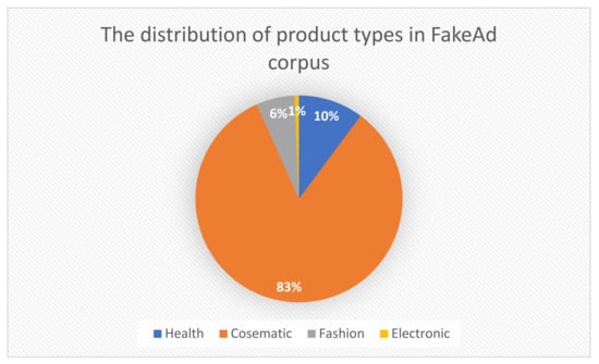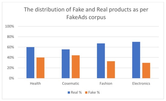 Figure 2 describes the most common product types in the corpus and their distribution in the FakeAds corpus. As shown in Figure 2, there was considerable emphasis on Twitter in promoting cosmetic products e.g., skincare, makeup, etc. The cosmetic class represents 83% of the annotations in the FakeAds corpus, health-related products come next after the cosmetic products with 10% of the total annotation in the FakeAds corpus. The less-dominant and lesser-targeted products in advertisements on Twitter and in the FakeAds corpus in particular were electronics and fashion. It was also noted that people on Twitter tended to discuss fashion and electronics products less frequently in the context of advertising when compared with cosmetics. Table 4 summarizes the statistics of the corpus, and it shows the total number of fake and real annotations and the distribution for the different products among fame and real tweets. Figure 3 visualizes the distribution of products that are targeted most by fake news and false information, which are cosmetic and health products compared to real information for these two types of products. On the other hand, it is worth mentioning that the number of real news information related to electronic and fashion products is significantly higher than the number of fake news that targets these two types of products. This is because online advertisements for products in social media platforms tend to target the younger generations and try to promote products relevant to their lifestyles, such as skincare products and different supplements that match their lifestyles.