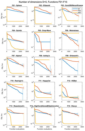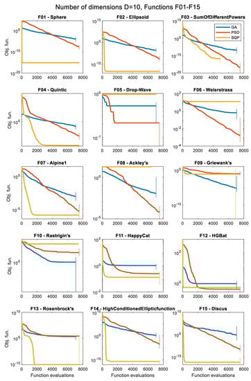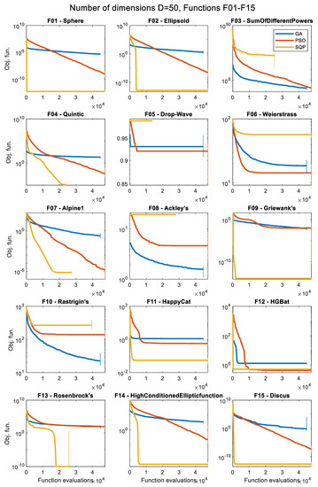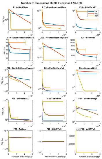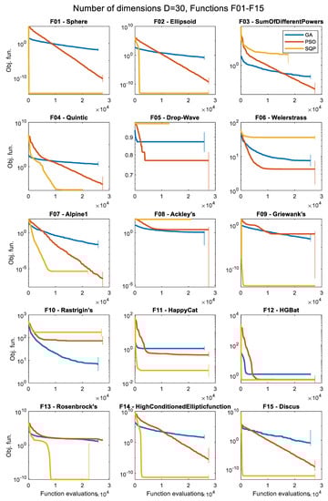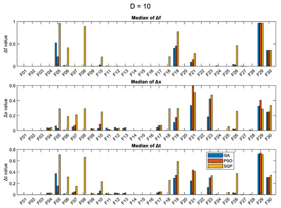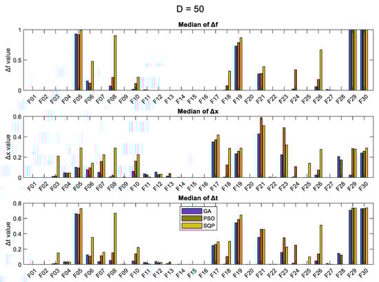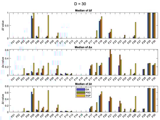As expected, the SQP shows the least variance of the results (lowest values of the standard deviation), in most cases, and this is particularly true for higher dimensions. The SQP seems to specialize in some specific problems, such as F01, F02, F13, F14, F15, F16, F20, F24, and F28, where it manages to get very close to the optimum solution, in comparison to the GA and PSO. The values of the Δf and Δx metrics provide a good indication of the performance of the algorithms and which problem is hard to solve. According to the Δf metric, the functions F05, F06, F08, F10, F18, F19, F21, F24, F26, F29, and F30 are hard to optimize, with F29 and F30 being the hardest.