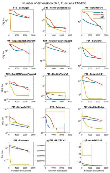 Convergence histories of the various optimizers for 5 dimensions (D = 5), for the objective functions F16 to F30 (median of 50 runs).