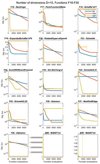 Convergence histories of the various optimizers for 10 dimensions (D = 10), for the objective functions F16 to F30 (median of 50 runs).