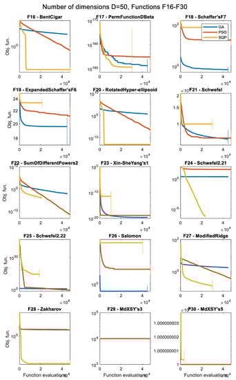 For all 30 objective functions, the minimum (target) value of the objective function is zero, as shown in Table 2. In our case, we run each algorithm 50 times, for each problem. The total number of optimization runs is therefore 3 × 4 × 30 × 50 = 18,000. Considering that the full convergence history of each individual run is recorded, together with the final optimum, the execution time, and other important parameters, it is obvious that the generated amount of data is massive, and it is not easy to present all these results in a simple, compact, and comprehensive way.