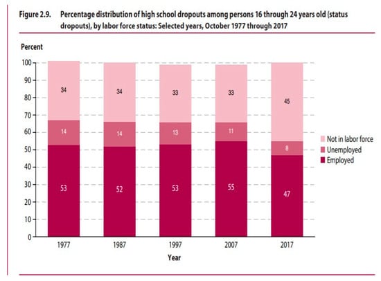 The average dropout has an annual income of only USD 20,241, which is USD 10,386 less than those with a high school diploma or GED []. That is the difference between living close to poverty levels by US standards and having a stable lower- to middle-class income. Over a lifetime, the average career earnings of dropouts are USD 260,000 less than those who earn a high school diploma or GED. A 2010 National Center for Education Statistics (NCES) study [] estimated that getting just one student to graduate from high school instead of dropping out would create an average societal net benefit of USD 200,000 over that person’s lifetime. High school dropouts in 2017 were also found to have the highest unemployment rate by far of any social class at around 13 percent []. For the first time on record, the majority of American dropouts aged 16–24 were not active participants in the labor force, as Figure 1 below shows. An increasing number of these people are no longer even employed in minimum wage jobs, as they were in prior decades.