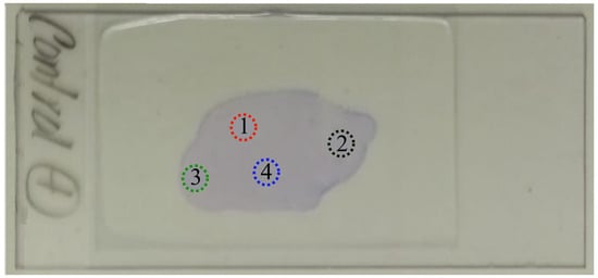 Photograph of the analyzed glass slides. The circles with a dotted line mark random positions on the sample.