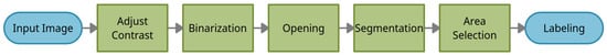 The labeling process consisted of developing an artificial mask image, which allows identifying the elements in the analysis image. In this case, it was decided to mark the three areas with larger objects using red, green, and blue labels. The processing started with an automatic contrast adjustment to improve definition, thresholding (conversion to black and white), then a morphological opening operation to smooth and eliminate small elements, then a segmentation to identify the connected objects, then the three elements with the largest area were selected, and finally, these were labeled to generate the artificial image that could be used as a reference. After being labeled, an expert on the observation and identification of Pneumocystis jirovecii reviewed and built the identification file for the presence of Pneumocystis jirovecii on the samples under test. Figure 2 shows the sequence of the process.