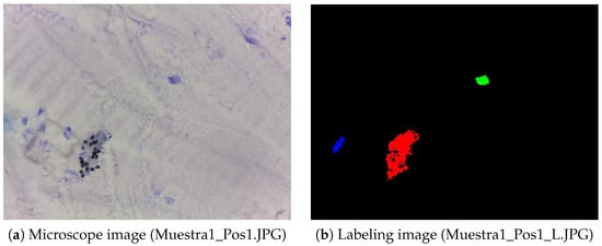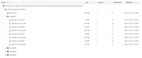 This dataset consisted of a set of images obtained using the method described in Section 2.3. An example of the microscopy image and the labeled image are illustrated in Figure 3a and Figure 3b, respectively. As mentioned earlier, the database presented in this work contained a total of 137 RGB images that can be used for the diagnosis of Pneumocystis jirovecii pneumonia. The path to access the collected images is shown in Figure 4, where the structure inside the repository, the version of each image, and the date can be seen, and in the root is the file “Labels.xlsx” with the labels of all the data and, inside each folder, the corresponding images. Likewise, The database can be accessed through the following link: https://doi.org/10.17605/OSF.IO/WQME8, accessed on 15 February 2022) (remember that samples from 29 different patients were analyzed). In turn, each folder contains photographs in at least four different positions to ensure correct diagnosis, as shown previously in Figure 1. To distinguish the images, a label was created according to the following nomenclature: MuestraXX_PosYYY.JPG, where XX and YY denote the sample analyzed and the position on the slide. For example, it is possible to find the image named Muestra1_Pos1.JPG inside the folder Sample01 (see Figure 3a). On the other hand, each folder also contains the labeled image (the segmentation was already described in Section 2.4). To distinguish it from the original image taken with the microscope, _L was added after the image name, for example: Muestra1_Pos1_L.JPG. These can be used directly in the classification and analysis algorithms of diagnostic images; in Figure 3b, the corresponding labeled image can be seen.