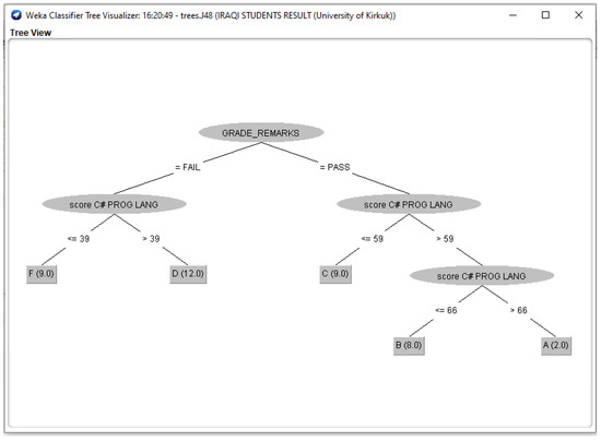 The Figure 3, Figure 4, Figure 5, Figure 6 and Figure 7 shown in this research study illustrates the J48 decision trees generated in WEKA for the five universities. In this section, we provided a detailed explanation of the J48 tree generated in the Section 3.3 of this work. The J48 decision tree classifier shown in Figure 3 illustrates that 11 students had grade A and passed with scores greater than 69 marks; 6 students had grade B, passed with scores greater than 59 marks and less than equal to 69 marks; 7 students had grade C and passed with scores less than or equal to 59 marks; 7 students had grade D and failed with scores greater than 39 marks; and 9 students had grade F with scores less than or equal to 39 marks. In general, a total of twenty-four students were in the category of those who passed while total of sixteen students were in the category of those failed. The J48 decision tree classifier shown in Figure 4 illustrates that 9 students had grade A and passed with scores greater than 69 marks; 7 students had grade B, passed with scores greater than 59 marks and less than equal to 69 marks; 10 students had grade Cand passed with scores less than or equal to 59 marks; ten students had grade D and failed with scores greater than 39 marks; and 4 students had grade F with scores less than or equal to 39 marks. In general, a total of twenty-six students were in the category of those who passed while total of fourteen students were in the category of those who failed. The J48 decision tree classifier shown in Figure 5 illustrates that 2 students had grade A and passed with scores greater than 66 marks; 8 students had grade B, passed with scores greater than 59 marks and less than equal to 66 marks; 9 students had grade Cand passed with scores less than or equal to 59 marks; 12 students had grade D and failed with scores greater than 39 marks; and nine students had grade F with scores less than or equal to 39 marks. In general, a total of nineteen students were in the category of those who passed while total of 21 students were in the category of those who failed. The J48 decision tree classifier shown in Figure 6 illustrates that 13 students had grade A and passed with scores greater than 67 marks; 4 students had grade B, passed with scores greater than 59 marks and less than equal to 67 marks; 4 students had grade C and passed with scores less than or equal to 59 marks; 4 students had grade D and failed with scores greater than 37 marks; and 15 students had grade F with scores less than or equal to 37 marks. In general, a total of twenty-one students were in the category of those who passed while total of 19 students were in the category of those who failed. The J48 decision tree classifier shown in Figure 7 illustrates that 4 students had grade A and passed with scores greater than 69 marks; 9 students had grade B, passed with scores greater than 57 marks and less than equal to 69 marks; 10 students had grade Cand passed with scores less than or equal to 57 marks; 12students had grade D and failed with scores greater than 37 marks; and 5 students had grade F with scores less than or equal to 37 marks. In general, a total of twenty-three students were in the category of those who passed while total of seventeen students were in the category of those who failed.