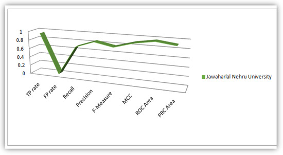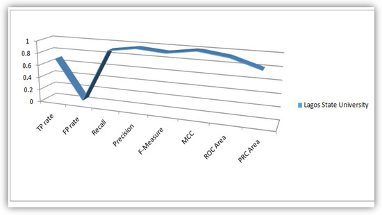 The parameters (TP Rate, FP Rate, Precision, Recall, F-Measure, MCC, ROC-Area and PRC-Area) obtained in this research work based on detail accuracy class analysis revealed from WEKA, we plotted flow lines that illustrate these parameters for the purpose of obtaining knowledgeable patterns to be displayed in a statistical perspective. These flow lines were illustrated based on values of the evaluation parameter derived from the WEKA analysis conducted on the five universities considered as case study in this work. Figure 8, Figure 9, Figure 10, Figure 11 and Figure 12 illustrates the plots of the parameters for the five universities.