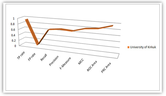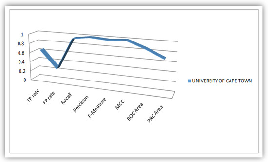 In the data analysis conducted, the three standard measures used in the evaluation of the classification qualities include the Recall, Precision and F-Measure. Precision is the ratio of the correctly classified cases of total number of misclassified cases and correctly classified cases [21]. The recall is the ratio of correctly classified samples to the total number of unclassified instances and correctly classified cases. The F-measure is the aggregate of the values of recall and precision [21,22]. Other measures used in the obtaining and evaluation of results include the execution time, TP rate, FP rate, ROC area, PRC area and confusion matrix [23].