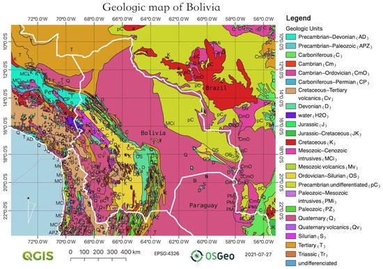 The most important geological provinces of Bolivia include the Madre dos Dios in the north, mostly covered by the Tertiary rocks (T), the Brazilian Shield to the east, the Oran-Olmedo Basin to the south (covered by the Cambrian-Ordovician outcrops), the Beni Basin in the central-northern segment of the country, and the Andean Province to the west (covering the Central Andes) with the intrusion of the Altiplano Basin. The formation of precious metals in the Andes includes a system of complex petrographic and geochemical processes that result in the evolution of magmas and lavas that underwent fractionation and assimilation in the Earth’s crust [86]. As a result, the mining industry has had a dominant position in the country’s economy since the 16th Century. As a result, Bolivia holds a leading position in the reserves of tin, zinc, silver, copper, gold, tungsten, lead, and antimony [87,88,89,90]. Besides, the Bolivian Salar de Uyuni salt flat is the world’s largest lithium deposit [91,92].