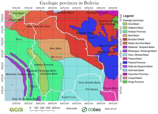 Geologic provinces in Bolivia and surroundings. Visualisation: QGIS. Source: author.