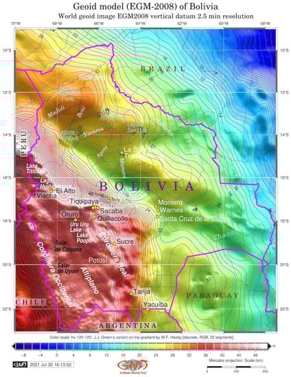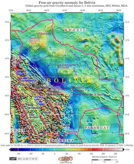 - Corchete, V.; Flores, D.; Oviedo, F. The first high-resolution gravimetric geoid for the Bolivian tableland: BOLGEO. Phys. Earth Planet. Inter. 2006, 157, 250–256. [Google Scholar] [CrossRef]