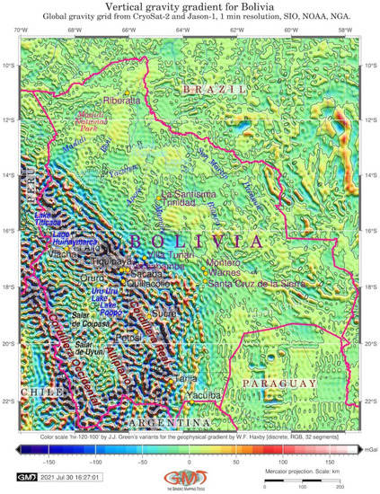 Vertical gravity gradient in Bolivia. Visualisation: GMT. Source: author.