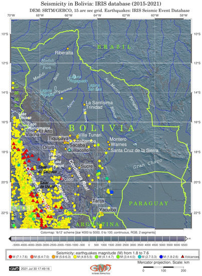The most significant earthquake in Bolivia was located 11 km NNE of Carandayti with a depth of 559 km and a moment magnitude of 6.8. Furthermore, some significant earthquakes within the strongest magnitude (above 7) were located in Peru: (1) 140 km WNW of Iberia, Peru, which took place in 2018 with a moment magnitude of 7.1 at a depth of 630 km; (2) 38 km SSW of Acari, Peru, also dated 2018, with a moment magnitude of 7.1 located at a depth of 39 km (shallow earthquake). Thus, one can conclude that the most significant earthquake during the last 6 years (2015–2021) in Bolivia did not exceed a moment magnitude of 7.0, which indicates a rather lower seismic activity in Bolivia and less risk to the population, if compared, for example, to Peru.