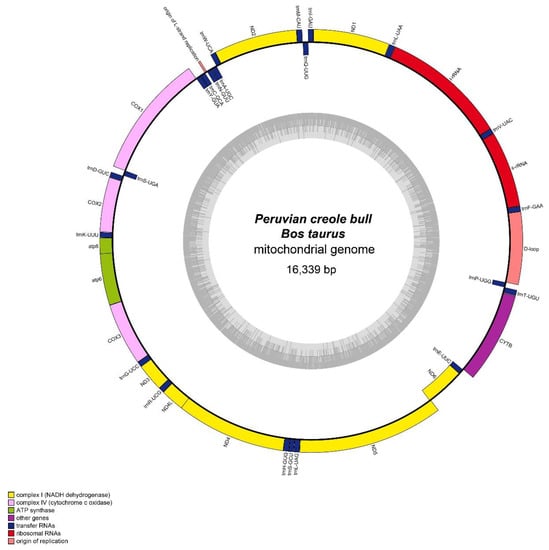 The mitochondrial genome map of the Peruvian creole cattle. Genes encoded by the heavy strand are shown outside the circle, while those encoded by the light strand are shown inside.