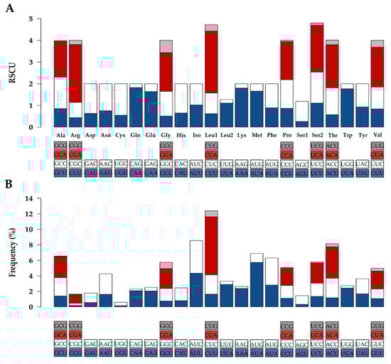 Codon usage of the mitochondrial genome protein-coding genes of the Peruvian creole cattle. (A) Relative synonymous codon usage (RSCU). (B) Codon usage frequency. Codon families are plotted on the X-axis and represented by different colors.